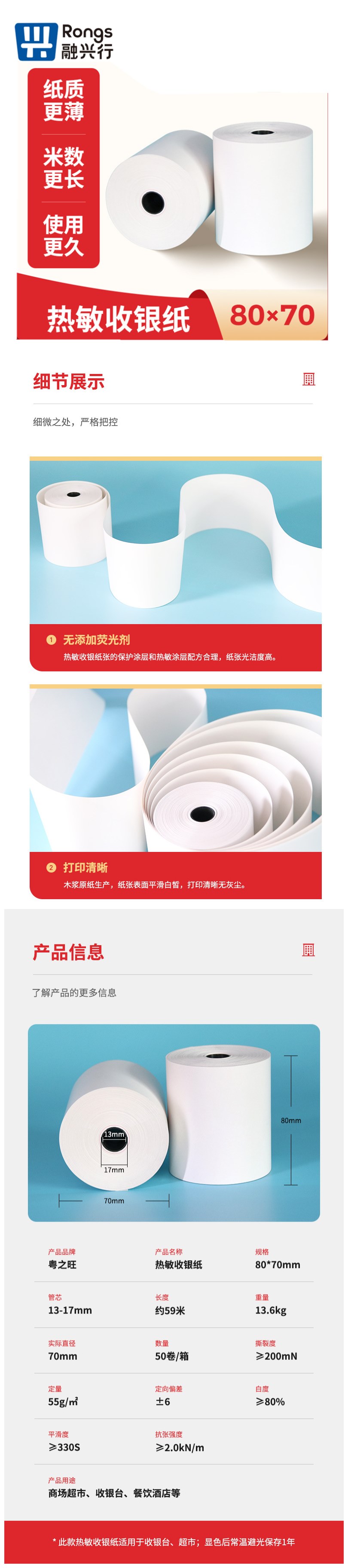 • 商品名称:20卷 热敏收银纸餐饮小票纸 80x70 mm